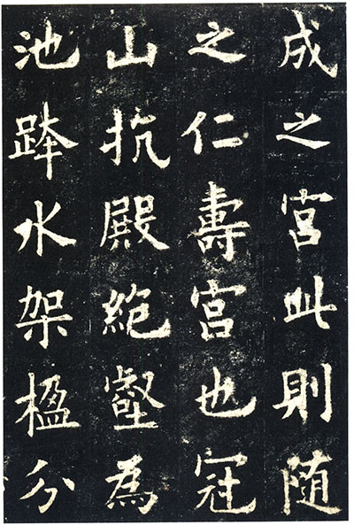 欧阳询书法的艺术特点,历代书评家评论很多。作为本文的要点,这里准备以欧阳询楷书最有代表性的作品《九成宫醴泉铭》为底本,对欧阳询楷书的艺术特点进行分析。