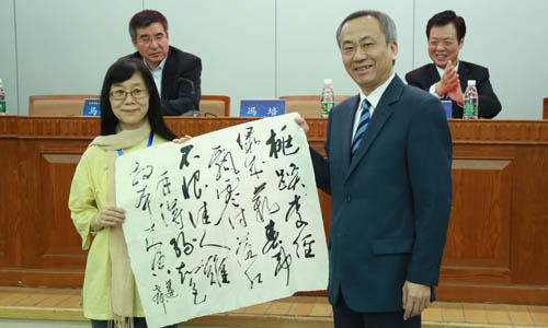 图为学者向北京第二外国语大学冯培书记捐赠书法作品。罗文玉摄