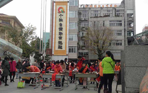 春节就要到了,福州市钱塘小学完成了期末考试,又开始了一年一度的义务写春联活动,这次墨韵轩会员有一百多人参加,还请来了省逸仙艺苑的三十多名书法家到现场书写。1月20日上午8:30,钱塘小学墨韵轩的会员们与逸仙的书法家们挥毫泼墨,为周边的居民义务写春联,将浓浓的祝福送进千家万户。