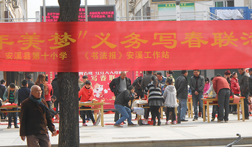 2月11日,书法报安溪工作站联合安溪县国税局、安溪县茗城社区居委会、安溪县第十小学等单位,召集书法家、书法爱好者、书法老师及安溪第十小学学生在安溪特产城广场举行“欢天喜地闹茗城 红红火火迎新年”义务写春联送春联活动。