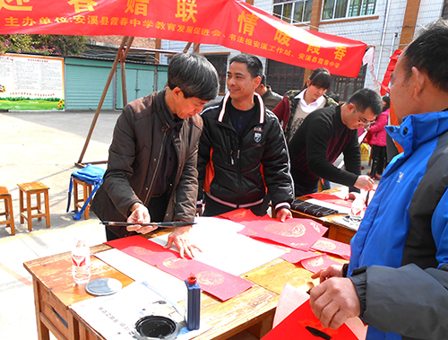 每到一处,从活动开始到结束,历时三至五小时,书法家们没有片刻休息,他们对热情的村民有求必应,现场挥毫泼墨,饱含激情地为当地老百姓书写春联。