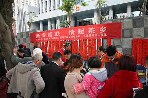 本网讯:为丰富安溪茶乡群众的精神文化生活,促进社区村镇的精神文明建设,《书法报》安溪工作站协同安溪县书法家协会、安溪县人民检察院、安溪县国税局、安溪县电力有限公司、安溪县茗城社区居委会、安溪县霞春中学教育发展促进会、安溪县霞春中学、安溪县第十小学等单位,倡议发动本县书法家、书法爱好者、返乡大学生暨爱好书法的中小学生,在春节前夕到县域各地义务书写赠送春联,取得了良好的社会效益,赢得社会各界的好评。