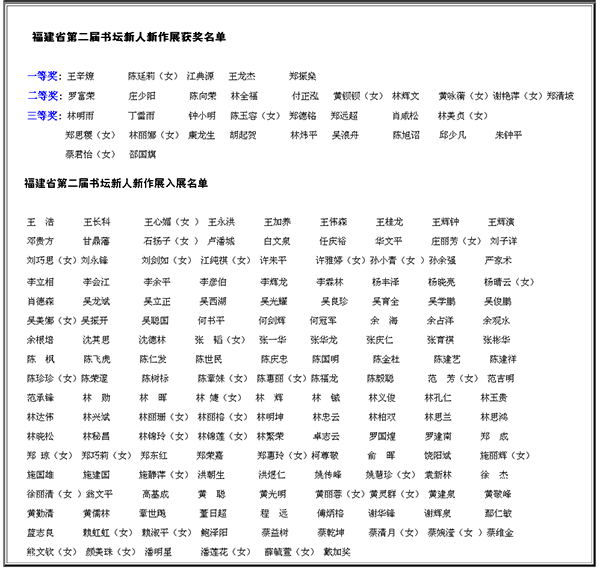 由福建省书法家协会主办的福建省书坛新人新作展的获奖名单于近日公布。福建省书坛新人新作展是我省专业性的书法展览之一。它是发现奖励书坛新人新作、培养和挖掘书法新人、展示书坛新人艺术风貌,同时也是我省书法爱好者加入福建书协的重要平台,对推动我省书法事业的繁荣发展具有重要意义。
