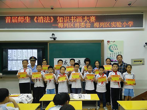 本网讯:5月27日下午,梅列实小和梅列区消委会联合举办了首届师生《消法》知识书画大赛。比赛分绘画、软笔、硬笔三个组进行,共150余名师生参加了此次比赛。师生们用手中的笔写下了“民以食为天”、“食以安为先”、“化解权益纠纷,促进社会和谐”……一幅幅书画作品,诠释对新的《消费者权益保护法》的理解和感悟。比赛结束后,评委对学生作品进行了评比,共评出一等奖5名,二等奖10名,三等奖15名,并进行颁奖。