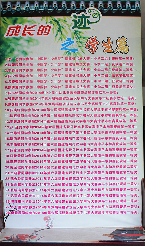 编者按:漳平市永福菁华小学是一所村级完小,现有12个教学班,27名教职员工,在校学生500余名。可就是这么一所看似不起眼的小学,却10年来坚持不懈抓书法教育工作,被评为龙岩市特色示范小学,漳平、龙岩市两级书法教研活动及创建特色学校推进会多次在该校召开,近日又被福建省教育学会书法教育委员会授予“书法教育实验学校”荣誉称号,是目前龙岩市唯一一所获得此殊荣的学校。今天,我们不想用文字去粉饰这所学校,而是特发一组真实照片,以飨读者眼球。