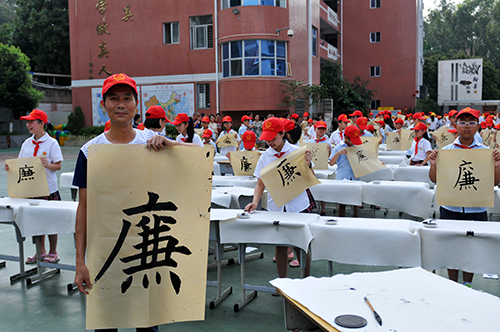 本网讯:为继承与弘扬中华民族优秀文化,检验学校书法特色办学成果,进一步丰富校园廉洁文化建设内涵,6月11日,泉州市丰泽区第八中心小学举办千人写“廉”书法创作暨省级“书法教育实验学校”验收活动。省书教委陈小敏会长、张大钧副会长、武良弼副秘书长、林昌理事,丰泽区委常委、纪委书记黄黎波及区委宣传部、区纪委监察局、区教育局、区文联有关负责人、全区各学校书记、区书法家协会部分书法家,共80多人参加了活动。