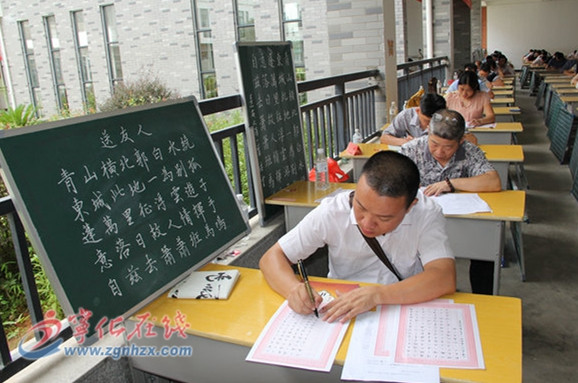 参赛教师书写粉笔字时以诗词《送友人》或《春日》为内容,运用楷书或行楷,在磁性小黑板上现场书写,限时20分钟书写完毕。书写钢笔字时以诗词《沁园春•雪》为书写内容,字体正楷或行楷,在统一的书写纸上现场书写,时间30分钟。参赛作品毛笔字以《山居秋暝》为书写内容,字体楷书、行书或隶书,统一在4尺宣纸上书写。