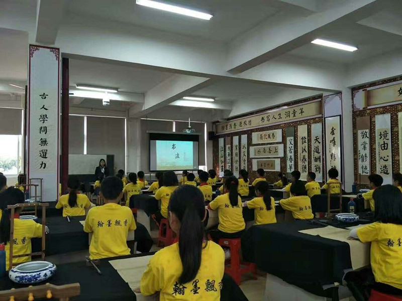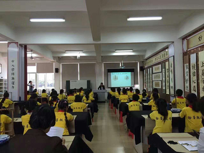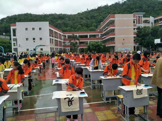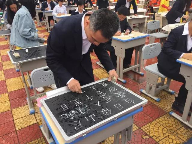 紧接着专家组观看师生现场书写展示活动,天空虽然灰蒙蒙的下着小雨,可全体师生参加展示的热情却丝毫不受影响,伴随着我校古筝班孩子们弹奏的古筝曲《茉莉花》,全体师生忘情地在宣纸上,黑板上挥洒着,如一幅画卷徐徐展开,整个校园犹如一幅水墨画般。