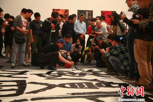 中新网杭州5月12日电(张骏)定神、执笔、沾墨、挥毫,一气呵成。12日,中国书法家协会理事、浙江省书法家协会主席鲍贤伦在浙江省美术馆现场挥毫创作,“玉壶买春,赏雨茅屋”八字肆意挥洒在20多平方米的宣纸上。鲍贤伦摒弃了千百年来约定俗成的“蚕头燕尾”隶书之特点,用篆书笔法写隶书,显得十分高古。此次,摄取晋人诗意的“我襟怀古——鲍贤伦书法展”将在今年6月于中国美术馆展出。