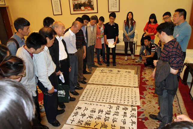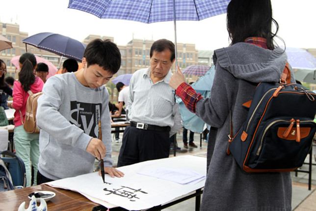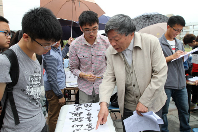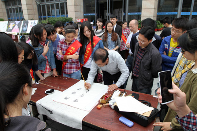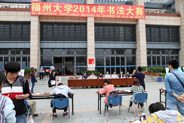 5月10日上午,由党委宣传部、校团委、校语委办主办,经济与管理学院承办的福州大学2014年书法大赛在旗山校区福万广场举办。中国煤矿书法家协会理事、福建书协会员张文华,中国书协会员吴德才,福建书协会员陈元春,福建书协会员、我校老年艺术协会会员、数计学院教授傅清祥,我校老年艺术协会会员、材料学院教授郑逊昭应邀到场担任评委并进行现场指导和点评。党委宣传部林志凯部长、刘朝晖副部长及校团委、经济与管理学院有关负责人出席了比赛现场。本次书法大赛也是响应福建省语委提出的“书法名家进校园”活动。