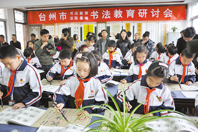 在全面普及训练的基础上,云健小学和松门小学还注重对优秀生的培养。云健小学挑选对书法特别感兴趣的学生参加学校培训联系,每天中午练习20分钟毛笔字,一有比赛,准备作品在三星期以上。松门小学专门创设了学校书画中心,其中组建了两级书法社团,一是以年级组为单位的年级书法兴趣小组,二是校级层面的书法社团,每周定期辅导。(金伟巍 文/图 )