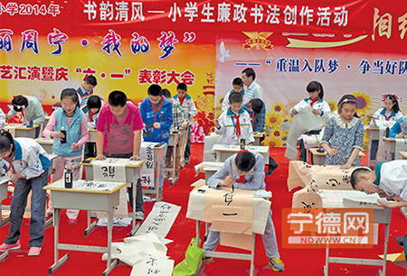 宁德网消息(李洪元 摄)5月30日上午,周宁实验小学与县纪委在学校操场联合开展了“书韵清香”小学生廉政书法创作活动,对学校师生进行了一次反腐倡廉宣传教育活动,让全校学生从小树立起正确的人生观、价值观,形成“廉荣腐耻”的文化氛围。