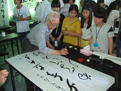老少书法笔会活动现场,老先生们挂出了自己预先写好的作品与师生交流并赠送给学校,70多位耘墨书法社的学生和学校爱好书法的老师前来参观交流。老先生们现场各自拿出自己的看家本领,或楷书、或行书、或草书,在簇拥的学生中书写出精美的作品,有的还根据学生的请求书写字幅赠送学生。学生的热情和对书法的热爱感染了在场的好手,他们一幅接一幅不停地书写,直至整个活动现场挂满了作品。