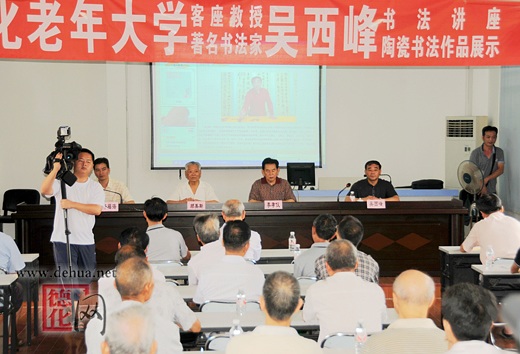 【德化网 讯】由福建省德化老年大学主办的“中国著名书法家吴西峰陶瓷书法作品展及讲座”于7月4日在“德化老年大学”三楼多功能会场开展。德化众多陶瓷艺术名家观赏了展出作品。