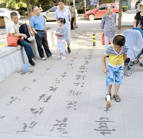 8月20日上午,省城迎泽公园,一个7岁小男孩的“书法”引来路人围观。起笔、落笔、回锋、收笔……小男孩神态自若,颇有风范。(闫 杰 摄)