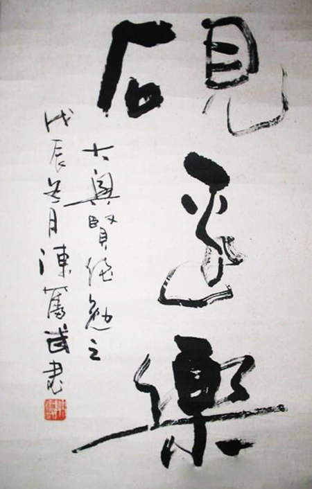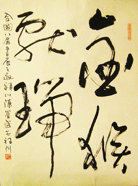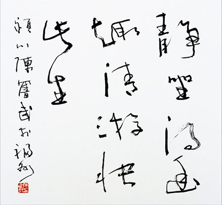 兴许胸次造化吐露于笔端,先生下笔处无一点俗气,而暗合书法书道。其书笔势气象与万化冥合,时见自然意象迹化,或行云流水,或逆水行舟,或峰回路转,或海水回澜,或惊涛拍岸,或浪遏飞舟,或飘若游云,或矫若惊龙,或抽刀断水,放意剪云……恍惚变幻,象其物宜,扑朔迷离。墨色忽湿忽枯时,或润含春雨,或燥裂秋风,气象万千,意态异趣纷呈。笔至活泼飞扬间,墨到会心会意处,寄得书家情愫思绪一片。品之,如入妙境,分明似有悦耳之音声旋律,娓娓牵人情思,一时形神俱忘。