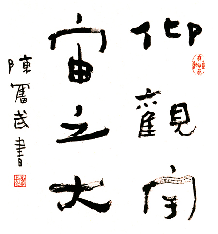 先生敏而好学,取法乎上,学书循唐楷,溯秦汉,于六朝碑碣领悟尤深,于魏碑汉隶致力最殷,探索最勤。先生经年染翰,日不离管,精研法帖,得书法传统之神髓骨力,熔冶诸家,驰思造化,故能新理异态,自然佚出。篆、隶、正、行、草……悉造其妙,而绝不与众人同。