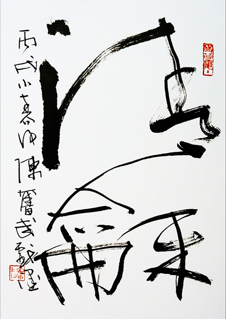 其甲子年作“天风海涛”榜书,信手写来,笔墨淋漓酣畅。观之似闻海啸雷鸣不绝于耳,犹见惊涛拍岸,动人心弦。庚辰书“闽海雄风”四字,根砥“二爨”①而自出机纾。旁书小字,轻盈洒脱,动静相宜。联句“在暗常先觉,临晨即自鸣”则妙掺汉隶,奇趣横生。