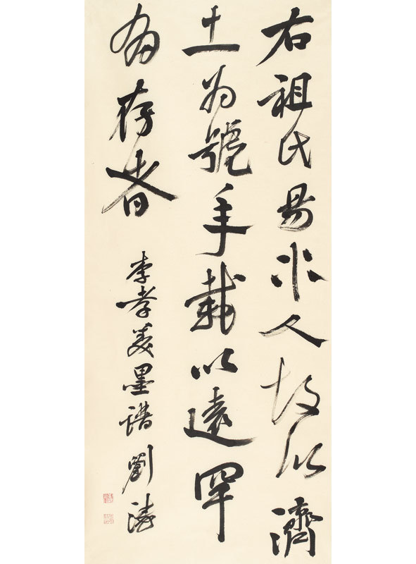 刘涛书法得益于王铎、徐渭等明代大家,注重线质,质中藏妙,妙中见妍,不类时风,且不流于刻意作态。其作品线条激荡,气势连绵不绝,用笔遒劲流畅,章法字间随势而安,行间递相映带,神完气爽,洒脱之气如奔腾野马,如疾风走草,作品中自然率真的天性跃然纸上。