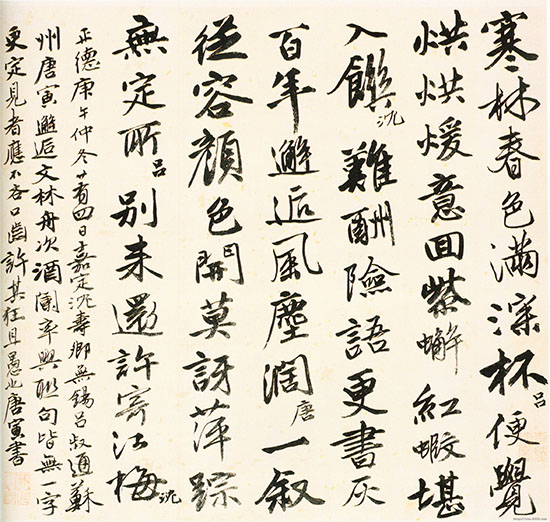唐寅的书法不及绘画、诗文出名,但天分也极高。他的书法主要学赵孟頫,更受李北海影响,俊逸挺秀,妩媚多姿,行笔圆熟而洒脱,唯笔力稍弱,钩挑牵丝绵软,结构亦略趋松散。