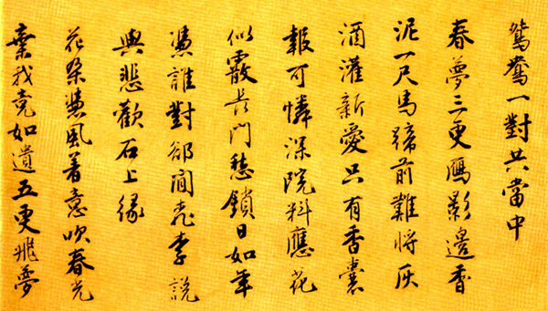 第二时期是30岁至36岁,唐寅科场被黜,妻子离异,无奈藉诗文、书画谋生,其时书法上追唐人,力求规范,尤宗尚颜真卿的楷书,用笔凝重,圆硕多肉,结体偏于长方,雄强茂密,点画横细竖粗,并吸纳隶法,横笔收尾似“蚕头”,捺笔收笔中途之顿近“燕尾”,极富力度,如唐寅作于弘治乙丑(1505年)36岁时的《落花诗册》。