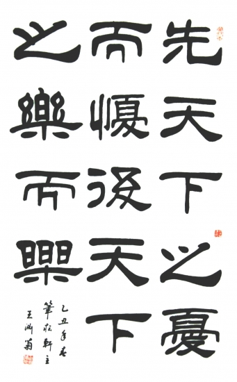 纵观王渊菊的五体书法作品,楷书刚劲雄健,行书意态生动,草书方圆相济,隶书取法高远,篆书蕴存活力。他的作品先后在欧美、亚洲等10多个国家展出,其中2000年赴泰国展览后,他的楷书、隶书和篆书作品被泰国皇家博物院收藏。2005年,王渊菊在福州举办了个人书法首展,引发福建书法界关注。