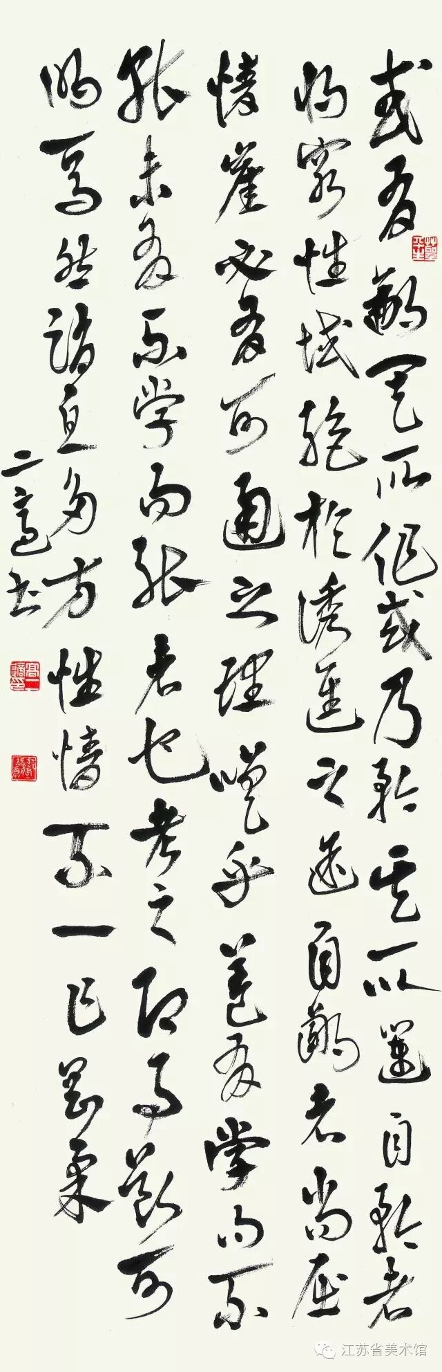 先生有渊博的文史知识,精鉴赏,长期在文史馆工作,博及群书,眼光很高,为书取法乎上,深造探求,他对自己的草书很自信,自认为天下第一,有多本书法集(含书评)出版问世。认为章草为今草之祖,习今草应从草录(章草)隶篆入门,则笔法入古、脱俗。年逾五十,主攻章草,广收历代《急就章》传本,考校本,及古残简碑贴字节,排比正章、审核异同,撰写《新定急就章及考证》一书,历时十载,1964年校补定稿,1982年出版,使坠失一千六百余年的章草免遭烟灭,国人惊动。在书法实践上,他巧妙地将章草、今草、狂草熔于一炉,既有高古的品格,又有奔腾跌宕之气势,尤以线条的劲幢、结字的紧密见长。看他的草书,才真正感觉到那笔锋在纸上奔突的力度。高二适学问素养极高,作品往往洋溢出浓郁的书卷气。文章、书法极受林散之先生推重。