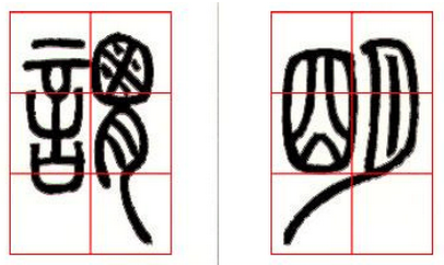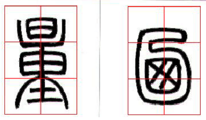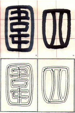 6、四角形全包围:(图五)中的“围”字,繁多的横画对空间作了整齐的分割,使空白舒畅明快起来,这在篆书结构上也是极为重要的。(图五)中“四”字内的两竖,向外弯曲呈背势,与外侧竖画形成对照,由下部的横画加以收拢,笔致优美而又生动活泼。
