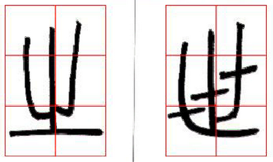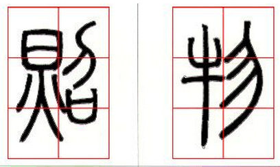 3、左低右高:左部只有可向下伸展之线条,右部只有可向上伸展之线条,如(图十八)“照”字,或左部有可向上下伸展之线条,而右部只可向上伸展之线条,如(图十八)“物”字。通常可以将左右位置安排为左低而右高。