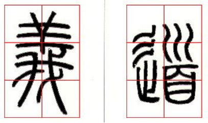 1、平行关系:篆书中直线条的处理通常是用平行的方法,如(图八)“义”字的各个横画,这些横画也不是真正的直横,也是呈弧形的横。篆书中曲线条的处理有时也多采用平行的方法,如(图八)“道”字的左上部和右上部的曲线。