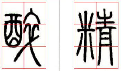 4、左居中:左部无上下伸展之画,右部有上下伸展之画,如(图十九)“醉”字;或左右都上下伸展之画,但左部稍小于右部,如(图十九)“精”字。这种情况通常将左右位置处理为左居中部。