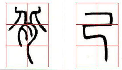 1、均匀:均匀是篆书布白之中着力追求的。线条之中平行、对称之法,与此是紧密相关的。如(图十三)“量”字诸横之间的空白,及中直线左右的空白几乎都是差不多的。而(图十三)“乃”字上部横画之间,下部上下左右的空白几乎是相同的。