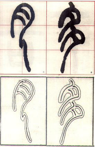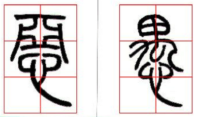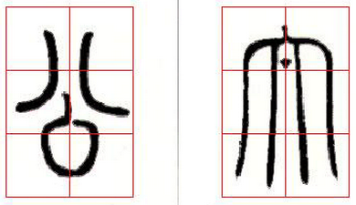 2、上密下疏:篆书除讲究线条之间留白的均匀外,还很讲究疏密的变化。小篆多数情况下采用上密下疏的安排方法。如(图十四)“心”、“荒”等字,都是上密下疏。