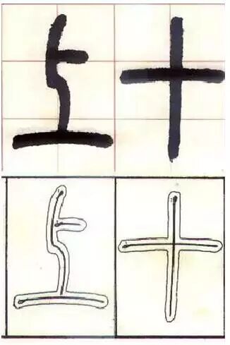 直包括或长或短的横、竖。其基本写法都要逆入驻收;就是藏头护尾,两头圆,中间部位粗细一致。也有少数横或竖是逆入平出而露锋的。如(图一)“太”字。邓石如篆书的横和竖并不全是一条笔直的线,除位于中心的竖用直线外,其横往往呈微微的弧形。很有动感。其笔法,可以从(图二)中的“上”字的横画以及“十”字中的横画上看出。