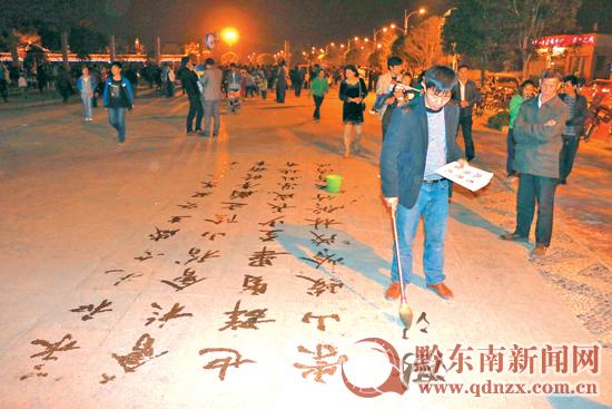 每当夜幕降临,街灯初亮,在天柱县城金凤广场总会看到一群书法爱好者,提起一只小水桶,扛着一支大毛笔,不约而来,他们“抢占”广场大妈们的广场舞“地盘”,一时簸箕大的字、一时巴掌大的字,写个不停,一首诗、一阙词的写下来,虽然汗水淋漓、手臂酸胀,可总是乐此不疲,为广场增添了不少文化气息,成为广场上又一道靓景。