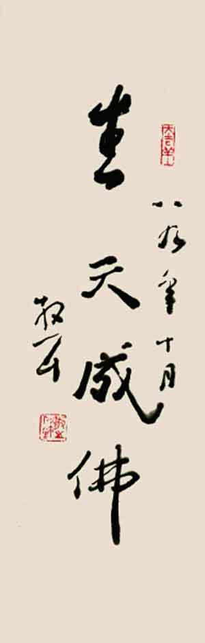 最后来看林散之。他的绝笔之作《生天成佛》是在其子林昌庚的协助下完成的。作为黄宾虹的弟子,除了能书擅诗之外,其山水画创作也独具面貌,但多数世人只知其一。林散之有“当代草圣”之誉,说的是他在草书艺术上探索之功深远。林散之书写《生天成佛》时的情景,据林昌庚描述道:“父亲喝了点人参汁,闭目养神了半个多小时,用有气无力的笔在宣纸上写了‘生天成佛’四个字,写好后,我在他指定的位置盖了印章。他闭目端坐,显得那样安详、超脱。他仿佛在告诉我们,他即将走到这个世界的终点,迈向另一个世界。”观此作,墨色浓淡相兼,字法遒劲有力,布白精道,有浑然天成之感。读其文,有人认为“生天成佛”中的“生”应是“升”字之误。这种解读毫无根据,从林散之经常写的对联“生天成佛谢灵运,旷世知音钟子期”中可知。林散之一生信佛,而“生”在佛家要义里边有“轮回”的意思,而“升”是一种单向运动,这与佛家对待生死的看法不相吻合。