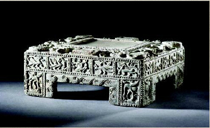1970年大同市南郊一处北魏建筑遗址中出土了一件精美的北魏石雕方砚。这件方砚用浅灰色细砂岩石雕成,正方形,高8.5厘米,长21.2厘米,宽21厘米,造型优美,正中突出长、宽各12厘米的方形砚盘,以联珠纹和莲花纹作花边。砚心两侧各有一耳杯形水池和方形笔舔,两端有鸟兽作饮水状,砚面对角有莲座笔插及联珠纹圆形笔舔,周边雕人物图案四组:骑象、角抵、舞蹈、沐猴。砚的四侧也各有图案,雕刻力士、云龙、朱雀、水禽衔鱼等。砚底正中雕莲花一朵,以它为中心,周边雕莲花8朵,并以9朵莲花纹构成砚底图案。这件方砚从砚面的浮雕耳杯形水池、砚侧的云龙、朱雀、水禽衔鱼等纹饰和下部壸门还保存着方形式样等处观察,都说明它比大同东部石家寨北魏太和八年(484年)琅琊郡王司马金龙墓的石雕还要略早。大同在北魏时期称为平城,在魏孝文帝迁都洛阳前的近百年中,平城一直是北魏的政治、文化中心。因此,保存在地上地下的文物十分丰富。这件精美的石雕方砚,发现在靠近旧城的东南城墙外。根据《水经注》和《大同县志》记载,这一带是北魏时期永宁寺的旧址。同出的文物还有1件海兽纹八曲银洗、3件鎏金高足铜杯、2件鎏金银碗和2对银锡。这批金属器物很可能就是在公元5世纪中叶至魏都南迁这期间传入平城的。